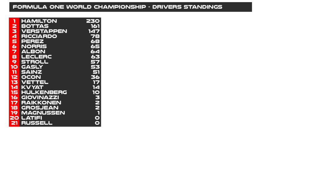Valtteri Bottas’s retirement was a massive blow to his title chances as he now sits 69 points behind his team-mate Lewis Hamilton, and he now looks set to take a seventh world title. Max Verstappen is still in third, just 14 points behind Bottas, ahead of Daniel Ricciardo, who has now moved up to fourth in the standings. Sergio Perez now lies in fifth ahead of Lando Norris in sixth, Alexander Albon in seventh and Charles Leclerc in eighth. Lance Stroll sits in ninth with Pierre Gasly rounding out the top 10.