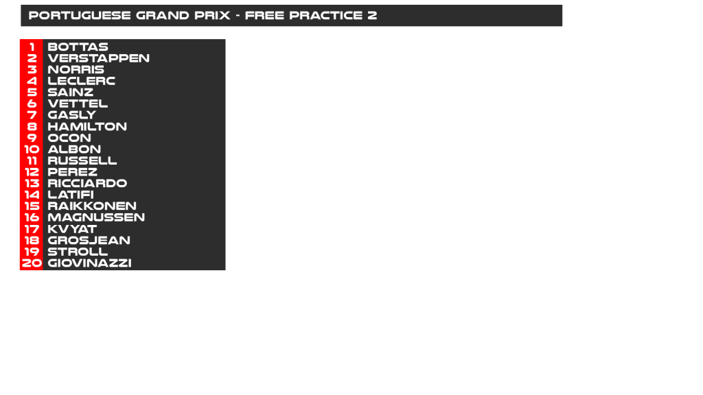 Due to these disruptions the order is a bit jumbled. The first half an hour of the session wasn’t massively relevant as Pirelli were testing 2021 prototype tyres. Valtteri Bottas ended the session on top once again on a 1.17.940, 5 tenths ahead of Max Verstappen who ended the session second fastest despite the incident. In third was Lando Norris who set a solid lap in the dying seconds of the session ahead of Charles Leclerc in fourth. Like his team-mate, Carlos Sainz put in a late lap to go fifth fastest, with Sebastian Vettel in sixth, ending a good day for Ferrari.