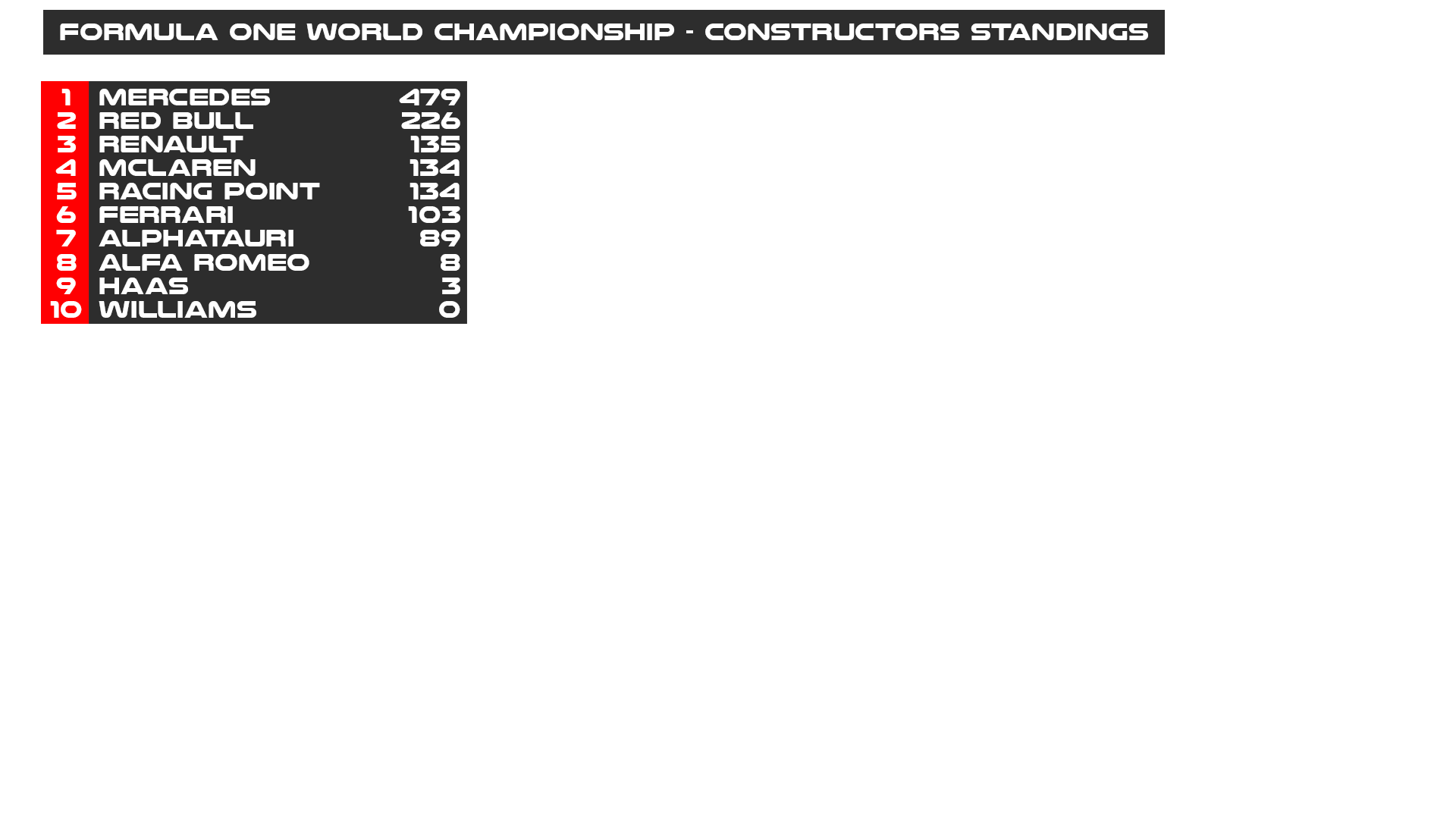 So it looks like the drivers is all but secured but the race for second could get interesting as it is not impossible that Max Verstappen could get on top of Bottas. In the battle for best of the rest, Daniel Ricciardo is now pulling away. In the constructors standings, Mercedes have the championship secured for a seventh time in a row. Red Bull look set for second, however it is the fight for third between Renault, McLaren and Racing Point keeping everyone interested, a battle that could change on a race by race basis.