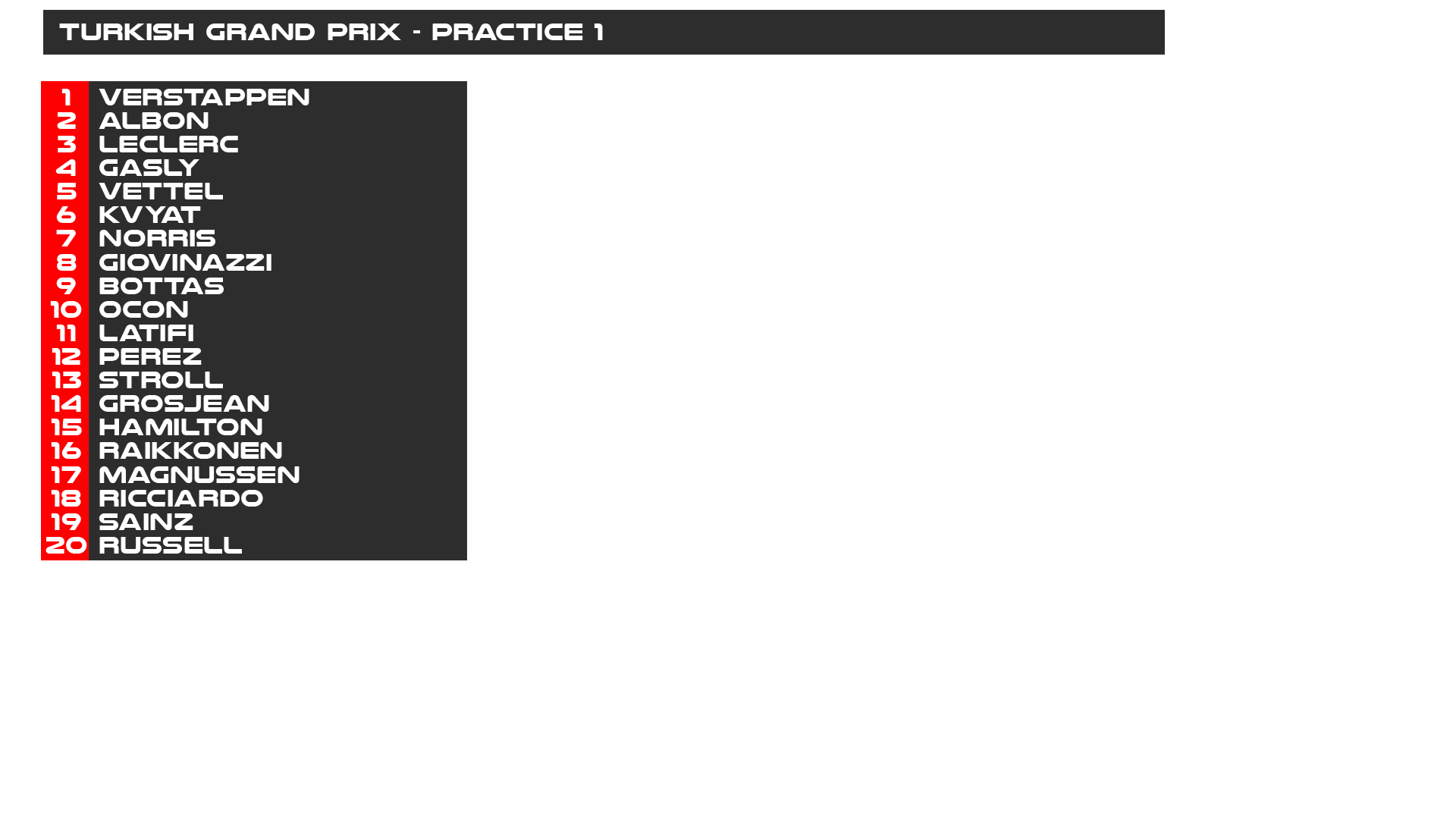 It was a Red Bull 1-2 with Max Verstappen topping the session on a 1.35.077 ahead of Alexander Albon in second place. Charles Leclerc set the third fastest time, having inadvertedly brought out the red flags earlier after taking out a bollard, ahead of Pierre Gasly, who ran the medium tyre. Sebastian Vettel set the fifth fastest time ahead of Daniil Kvyat who like his team-mate ran the medium tyre.