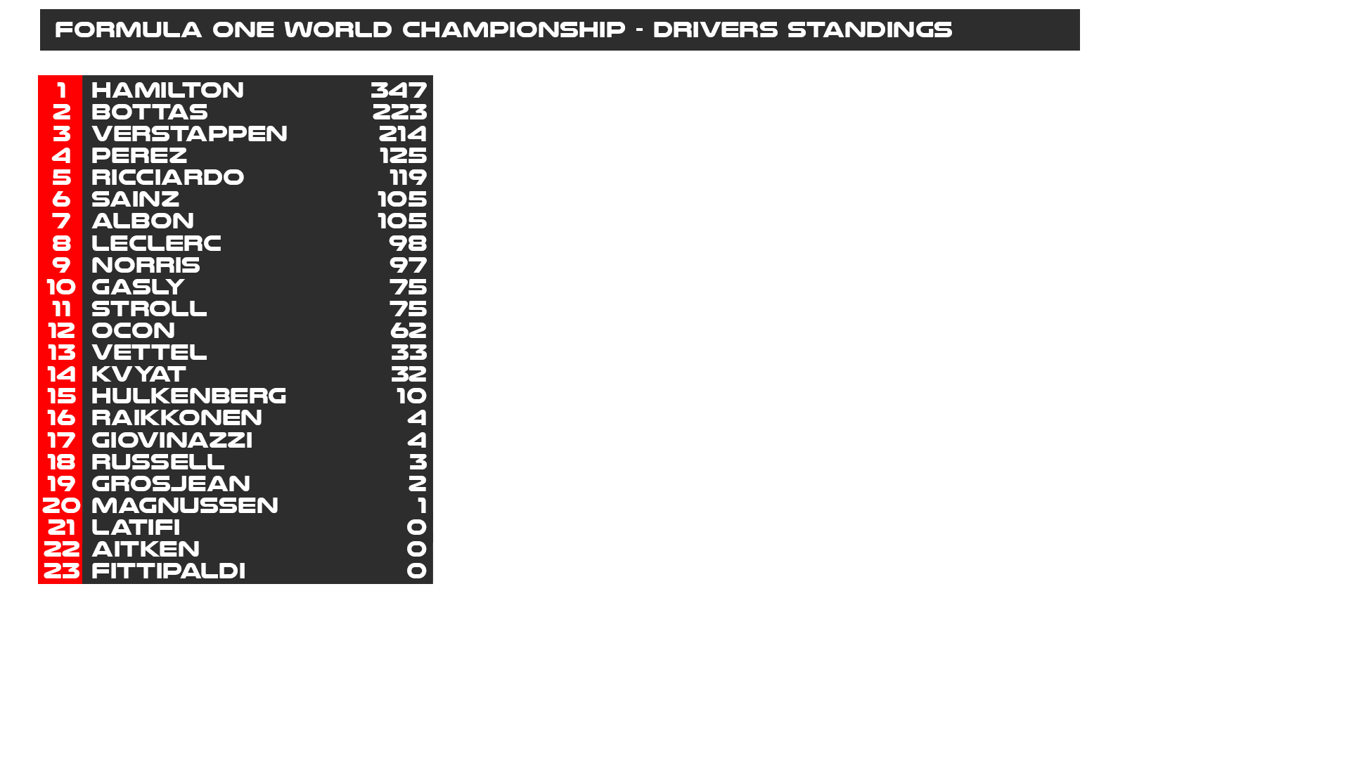 The 2020 season has come to an end with Lewis Hamilton winning convincingly with a gap of 124 points, his largest ever winning margin. Max Verstappen could not quite get ahead of Valtteri Bottas for second in the standings but he did get very close. Despite his retirement, Sergio Perez maintained fourth in the drivers standings however Racing Point would not maintain third, having lost out to McLaren at the final race.