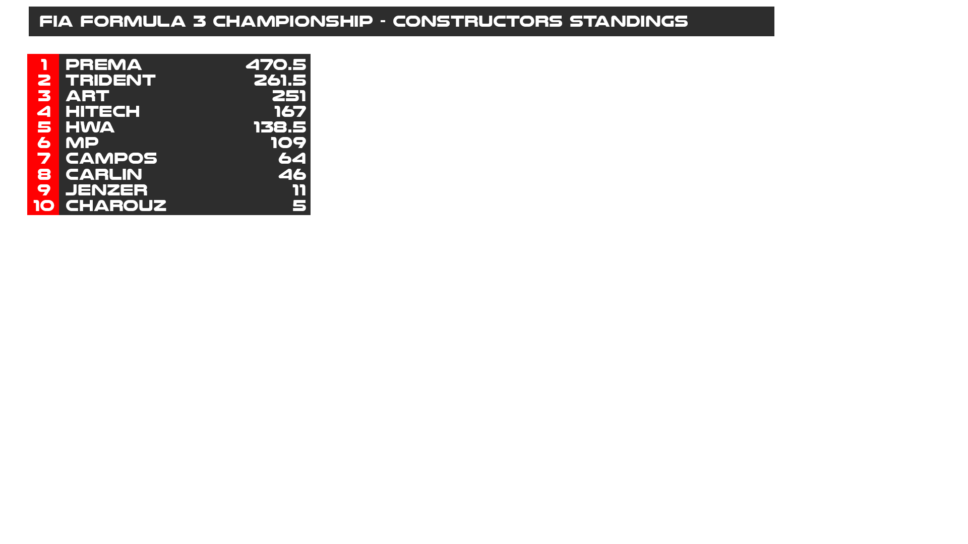 Prema took the constructors championship for a second consecutive year, however they were not as dominant as they were in 2019, when they locked out the top 3 positions in the drivers. However being the only team with all 3 drivers consistently up there, they still took the crown by 209 points. Trident finished in second, beating out ART by 10.5 points. Whilst it was a slightly disappointing season for Hitech who probably expected better than fourth.