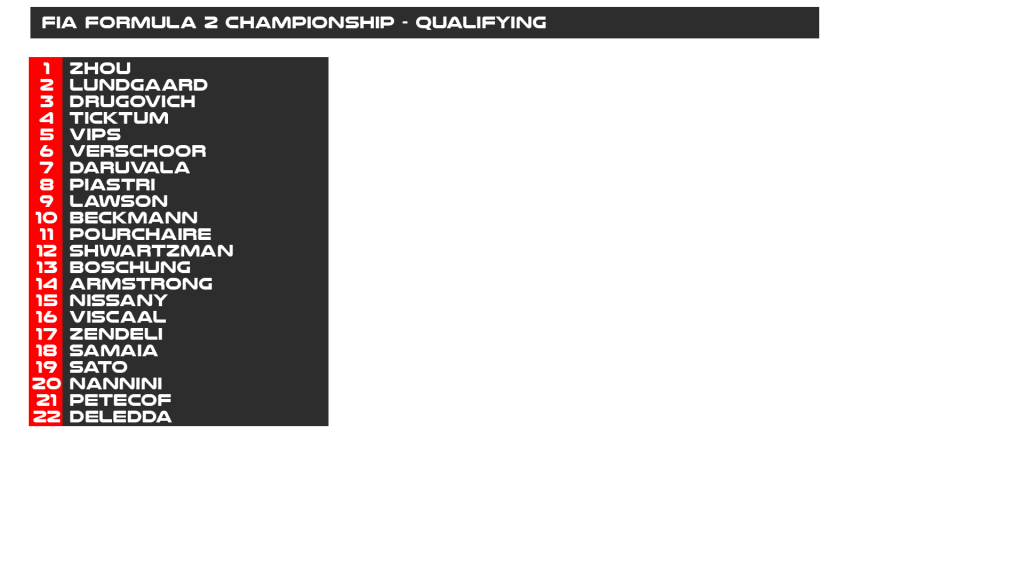 Felipe Drugovich showed pace in the early stages of the session but will have to settle for third ahead of Dan Ticktum in fourth, Juri Vips in fifth, and Richard Verschoor, who qualified a surprise sixth. Jehan Daruvala qualified in seventh ahead of Oscar Piastri in eighth, Liam Lawson in ninth and David Beckmann takes reverse grid pole for the first race of the season in tenth.