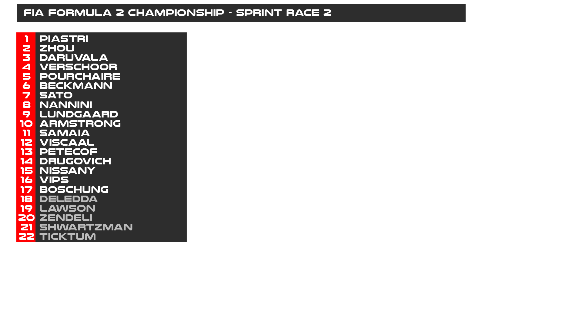 Juri Vips looked like the one that would pass him for the win but a car problem halted his charge, putting Oscar Piastri in the box seat. In a thrilling final lap between him, Christian Lundgaard who had a time penalty for taking out Lirim Zendeli, and Guanyu Zhou, who did everything to keep the lead, Oscar Piastri managed to muscle his way through and take the lead. He would take his maiden Formula 2 victory, ahead of Zhou and Jehan Daruvala.