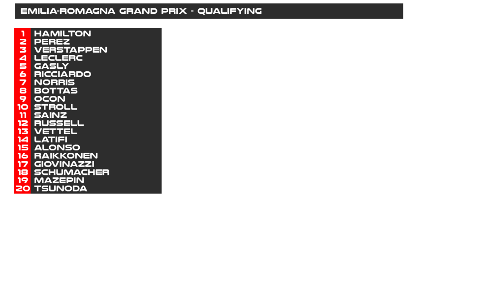 Charles Leclerc qualified in fourth, underlining the improved pace of the Ferrari ahead of Pierre Gasly, who once again showed the pace of a fast AlphaTauri. Daniel Ricciardo qualified in sixth ahead of Lando Norris, who initially got up to the front row with his lap but he lost it due to track limits. Valtteri Bottas had a shocker, qualifying down in eighth after a mistake on his laps, ahead of Esteban Ocon in ninth, and Lance Stroll rounds out the top 10 having had both his Q3 laps deleted.