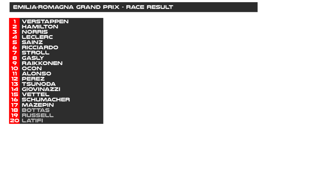 The two Ferraris of Charles Leclerc and Carlos Sainz finished just behind in fourth and fifth, showing good pace at a home race, ahead of Daniel Ricciardo who had a quiet race to sixth. Lance Stroll grappled with gearbox issues throughout the race but managed to bring his car home in seventh ahead of Pierre Gasly, who fell down the order after starting on the wet tyre, which proved to be the wrong choice, but the red flag put him back in contention for points. Kimi Raikkonen and Esteban Ocon rounded out the points, taking their team’s first points of the season.