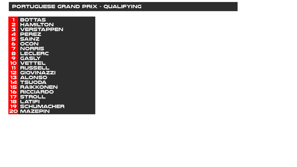 The big shock of Q1 was Daniel Ricciardo failing to make it past the first part of qualifying, he will start in sixteenth after a scrappy final lap ahead of a disappointed Lance Stroll. Nicholas Latifi qualified in eighteenth with the two Haas cars of Mick Schumacher and Nikita Mazepin rounding out the grid.