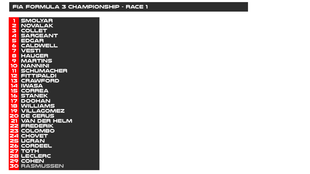 Caio Collet finished as top rookie in third place, having been ahead of Novalak for much of the race but lost out after a battle with Edgar. Logan Sargeant finished in fourth ahead of Jonny Edgar who came home in fifth place.