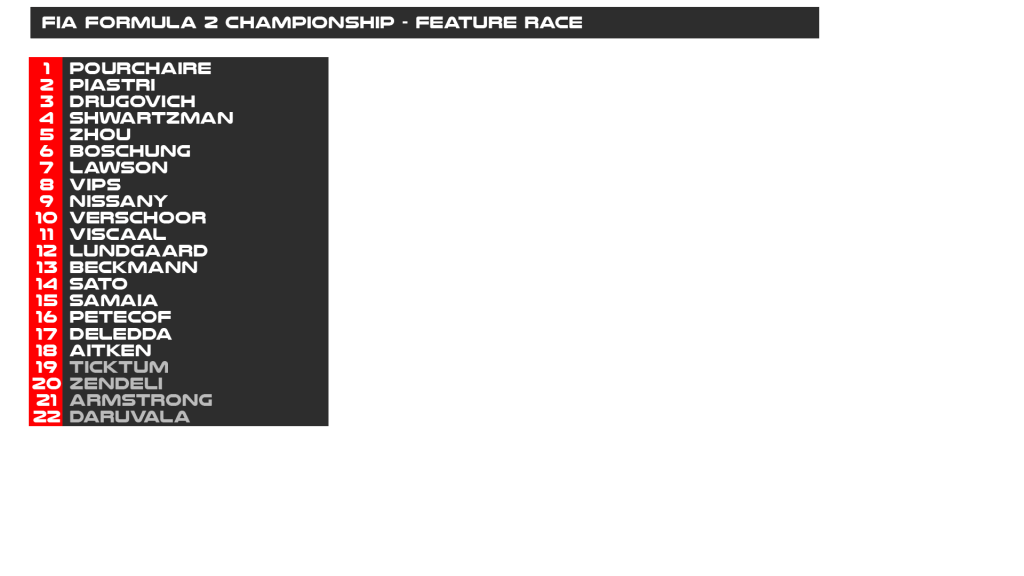 Felipe Drugovich made the alternate strategy work finishing in third ahead of a disappointed Robert Shwartzman in fourth. Guanyu Zhou went very long on his first stint and finished in fifth place ahead of Ralph Boschung, who completed a great weekend to finish in sixth. Liam Lawson bounced back from having victory snatched from him through a technical infringement to finish in seventh ahead of Juri Vips in eighth, Roy Nissany in ninth and Richard Verschoor rounding out the top 10.