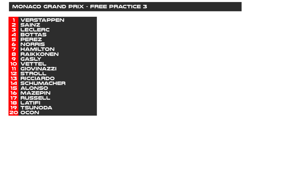 Max Verstappen set the fastest time in the final practice session in Monaco by a few hundredths of a second over the two Ferraris of Carlos Sainz and Charles Leclerc who look like they are definitely in the fight for pole.