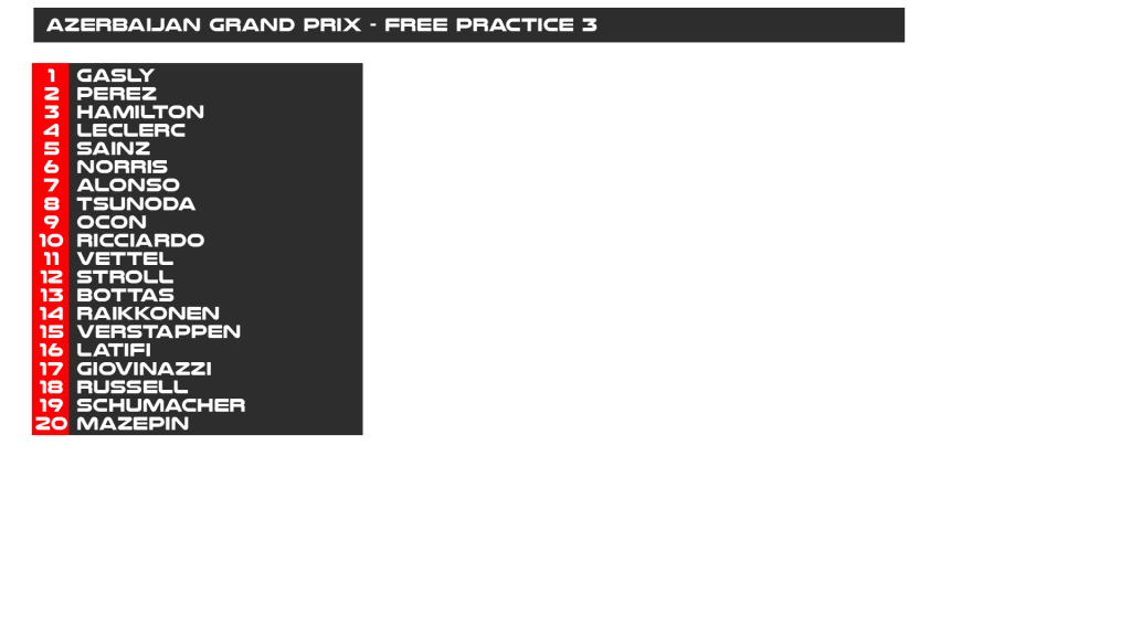 Free Practice 3 was frenetic, with multiple drivers making mistakes, which saw Pierre Gasly set blistering pace, setting a laptime 3 tenths of a second ahead of Sergio Perez in second place. The latter was the only Red Bull driver to set a legitimate qualifying simulation as Max Verstappen crashed and bent the suspension, ending his session early.