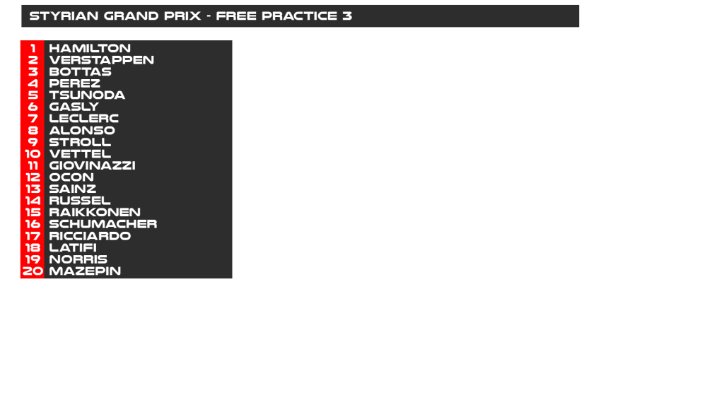 Lewis Hamilton set the fastest time in final practice session, 2 tenths of a second ahead of his championship rival, breaking Max Verstappen’s streak. However that doesn’t mean to say Max did not look in top form, his qualifying simulation was compromised by Nicholas Latifi’s Williams at Turn 3.