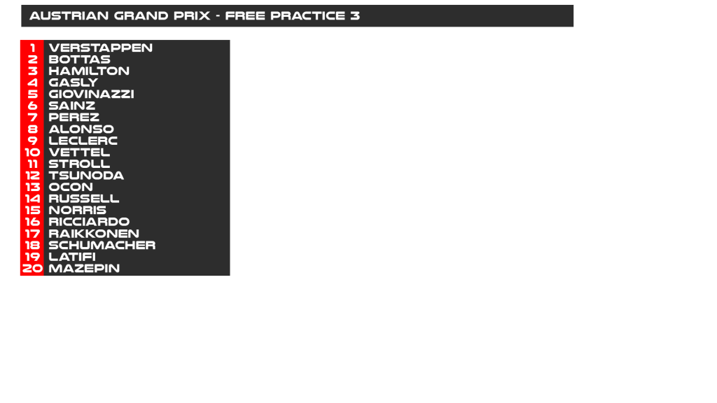 Pierre Gasly was fourth for AlphaTauri. Antonio Giovinazzi had a great session to end fifth ahead of Carlos Sainz in sixth, Sergio Perez in seventh and Fernando Alonso in eighth. Charles Leclerc ended the session ninth with Sebastian Vettel rounding out the top 10.