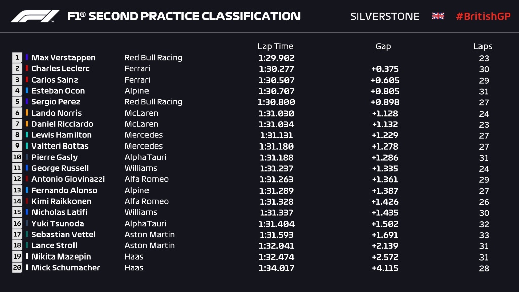 Esteban Ocon had a good session to end up fourth ahead of his ex-teammate in fifth and the two McLarens of Lando Norris and Carlos Sainz. Then it was the two Mercedes evidently sandbagging, whilst Pierre Gasly rounds out the top 10. Here is the result of FP2 from Silverstone.