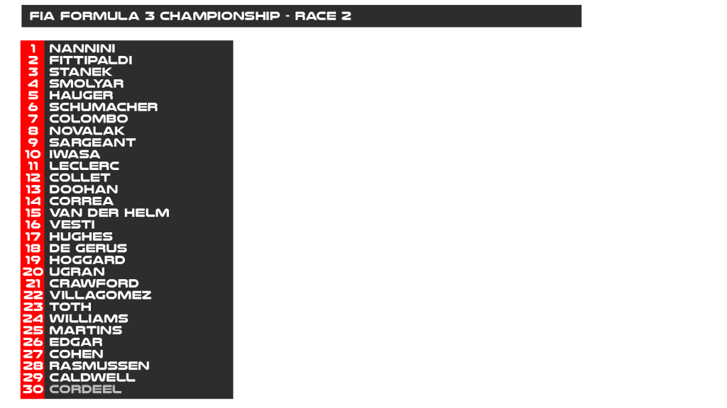 It was a frenetic second Formula 3 race at the Hungaroring, which saw Matteo Nannini take the lead from Enzo Fittipaldi to take his maiden Formula 3 victory after many close attempts. Second place went to Fittipaldi, with third place going to Roman Stanek for Hitech.
